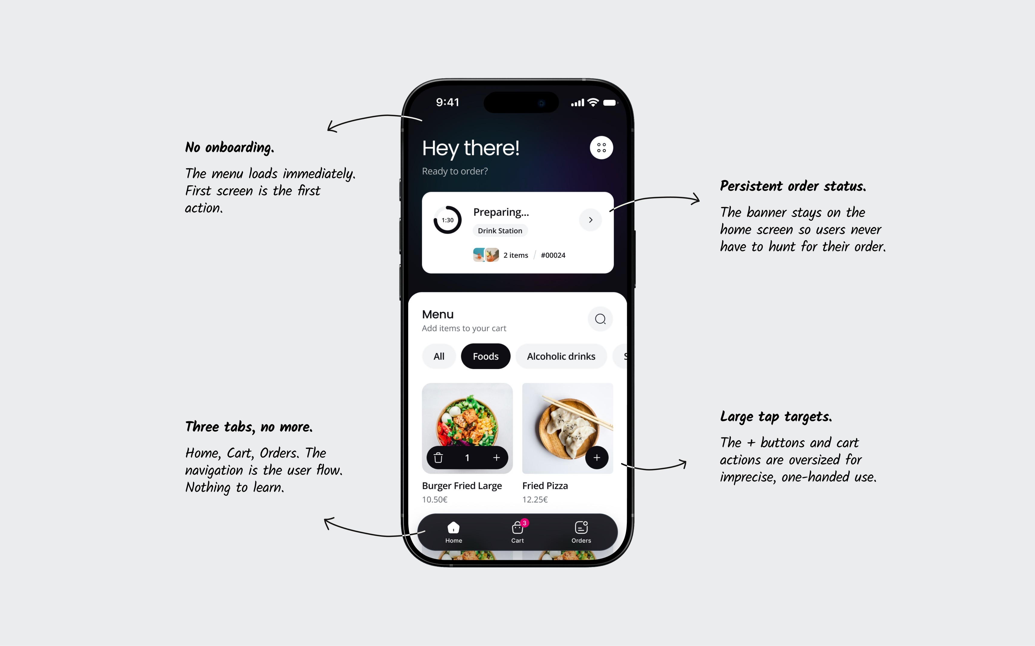 On the bartender side, the same principle applied in reverse. The bartender is moving fast, their hands are busy, and they can't stop to study a screen. So the most frequent action, marking an order as ready, is a single tap directly on the order card. No need to open a detail view for the most common task.