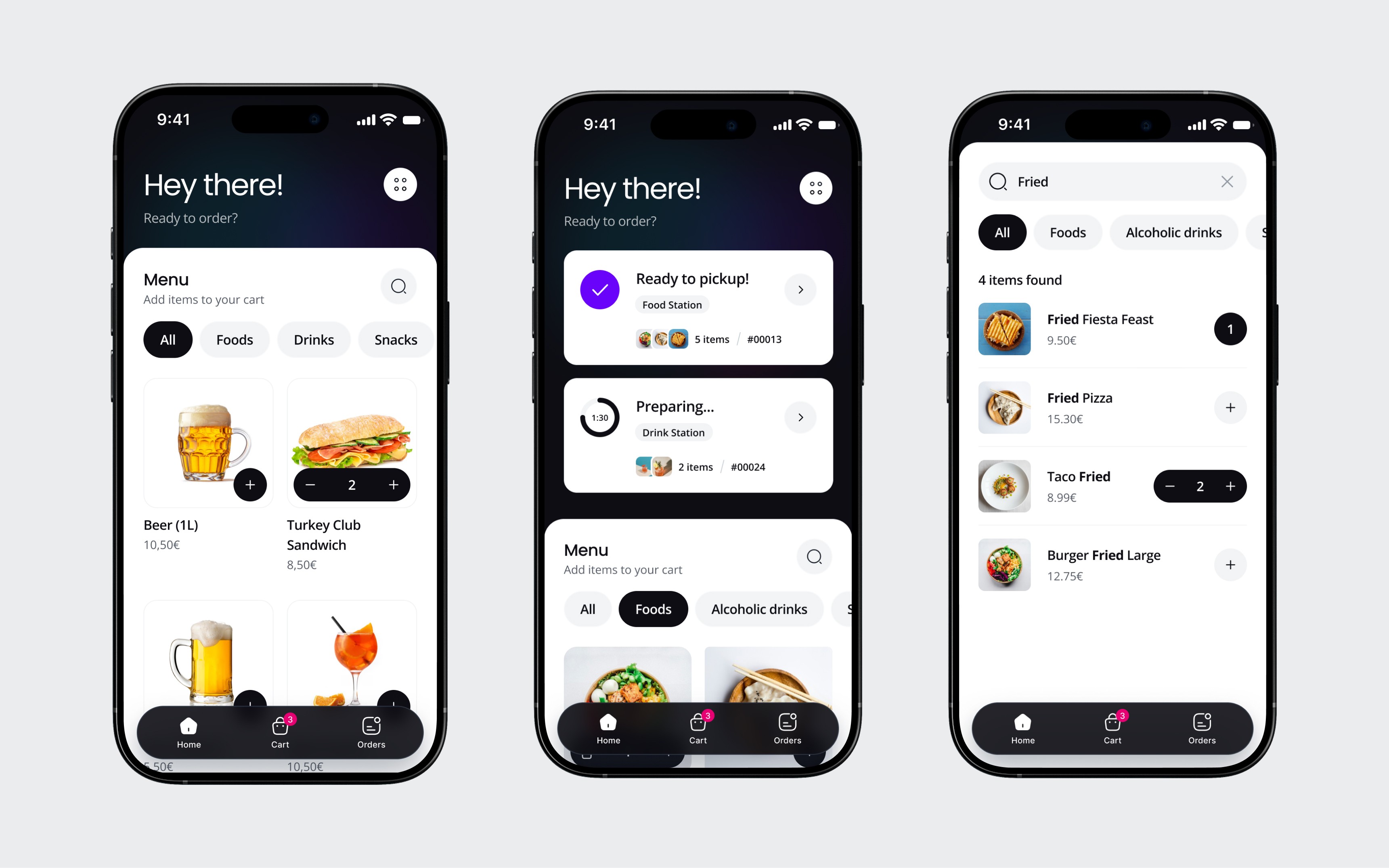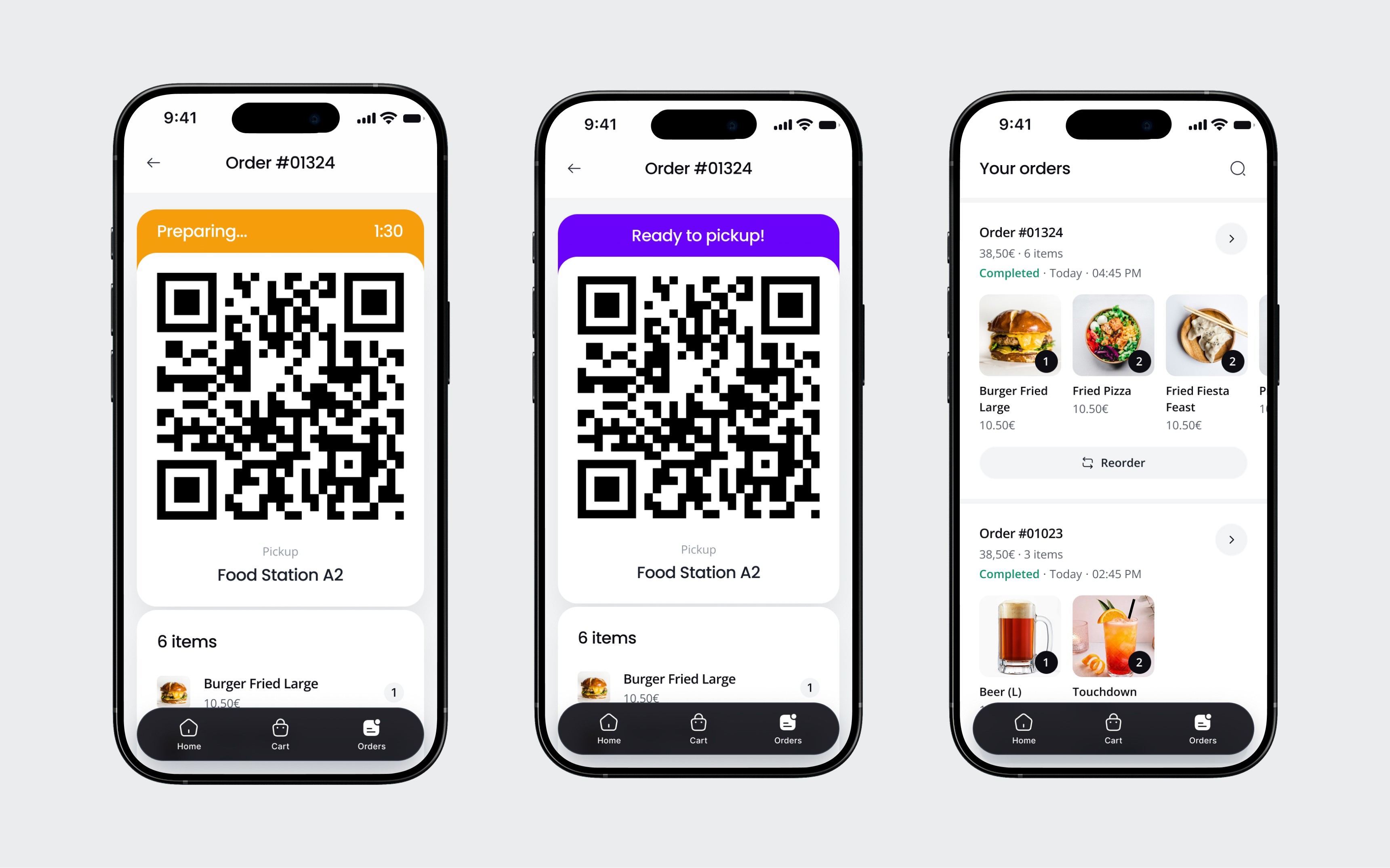 I structured the guest app around three tabs: Home (the menu), Cart, and Orders. No settings, no profile, no onboarding. The navigation is the user flow.
