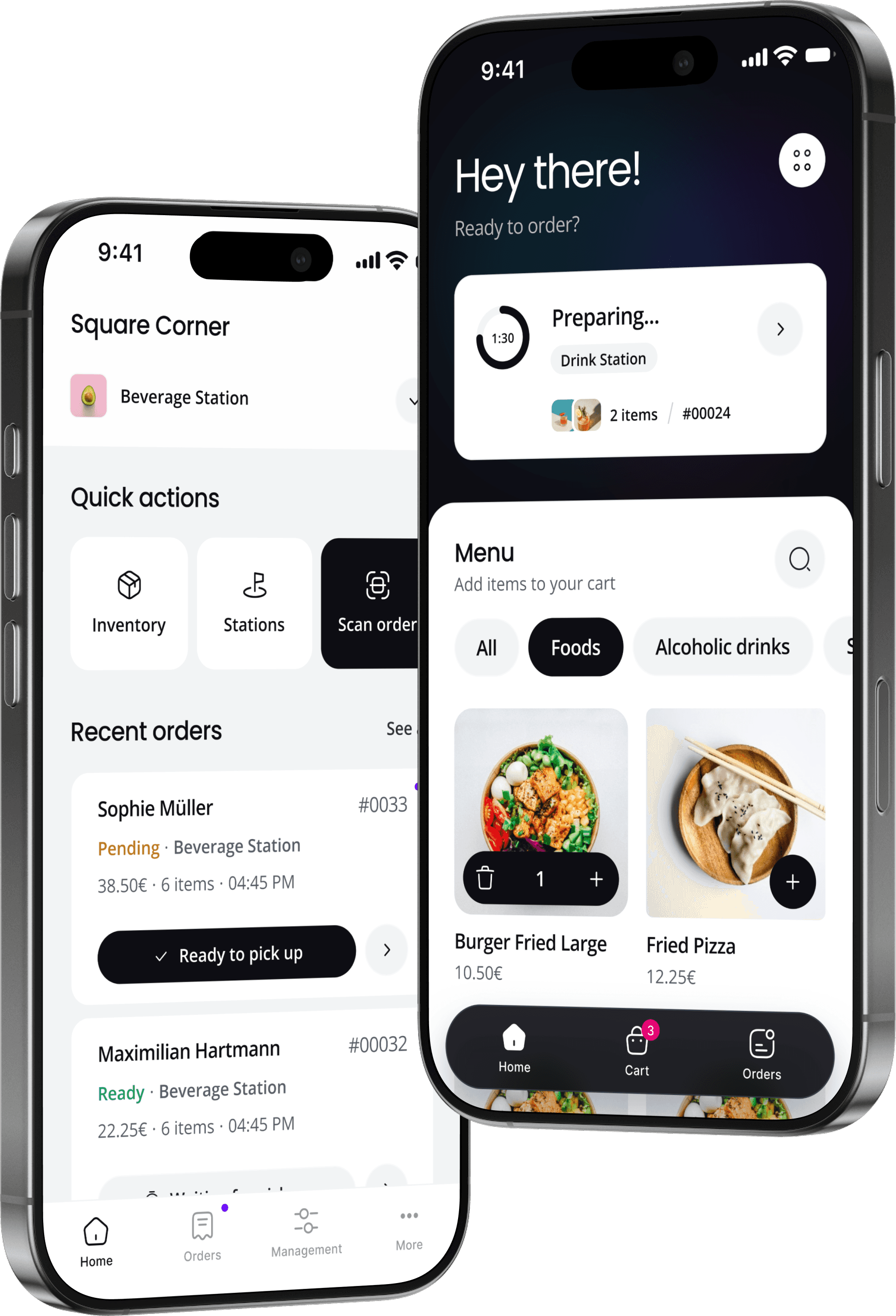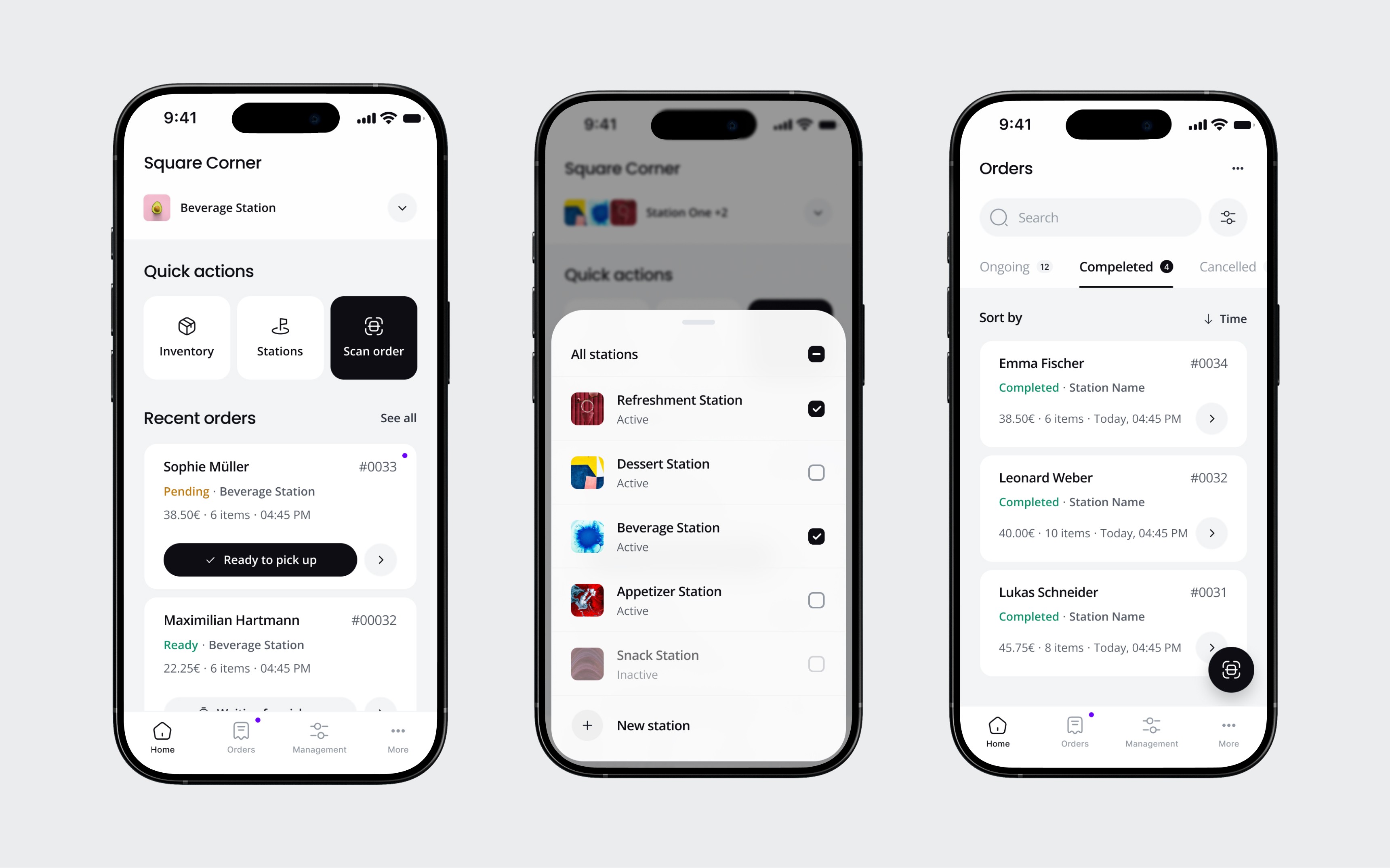 The home screen shows recent orders with the most important action front and center: "Ready to pick up." Bartenders can update an order's status without opening the detail view. "Scan order" is the biggest quick action button because that's what happens most frequently at the pickup counter. The app also supports multiple stations, so a single provider can manage food and drink bars separately or together.