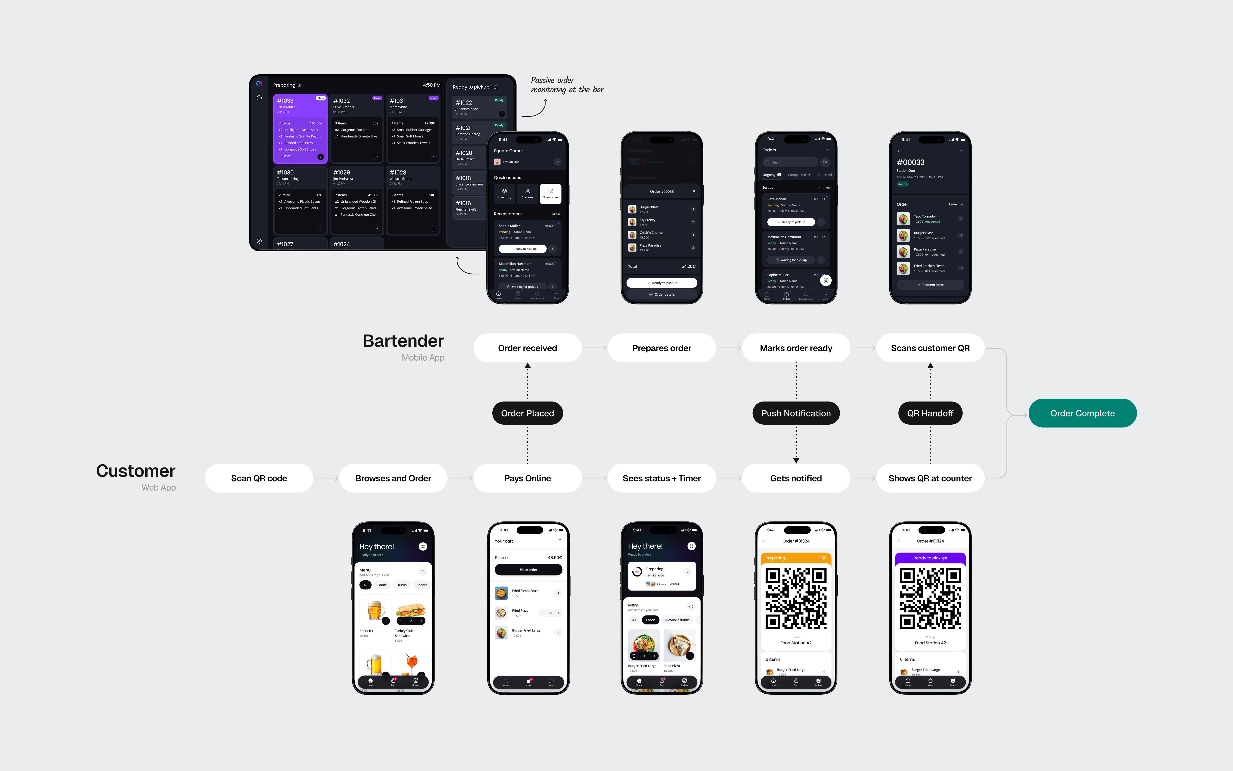 The tablet dashboard takes this even further. It's designed to be read from a distance. Large order numbers, clear column separation between "Preparing" and "Ready to pickup," high contrast on a dark background. Bartenders glance at it the way a cook glances at a ticket rail. No interaction needed.