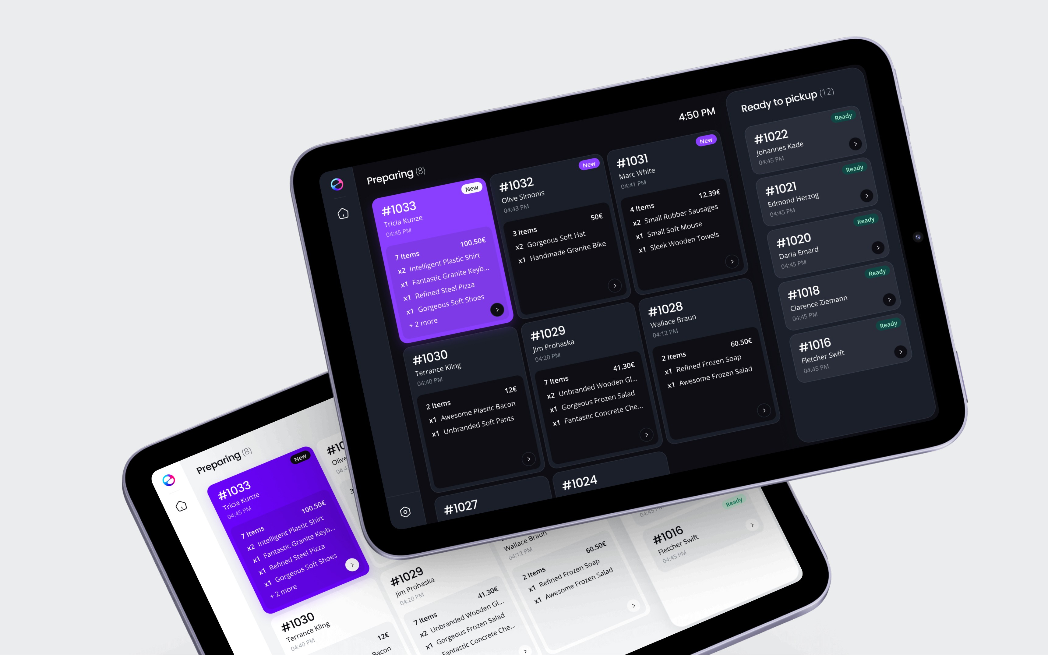 The tablet dashboard for passive monitoring. Preparing orders on the left, ready for pickup on the right.