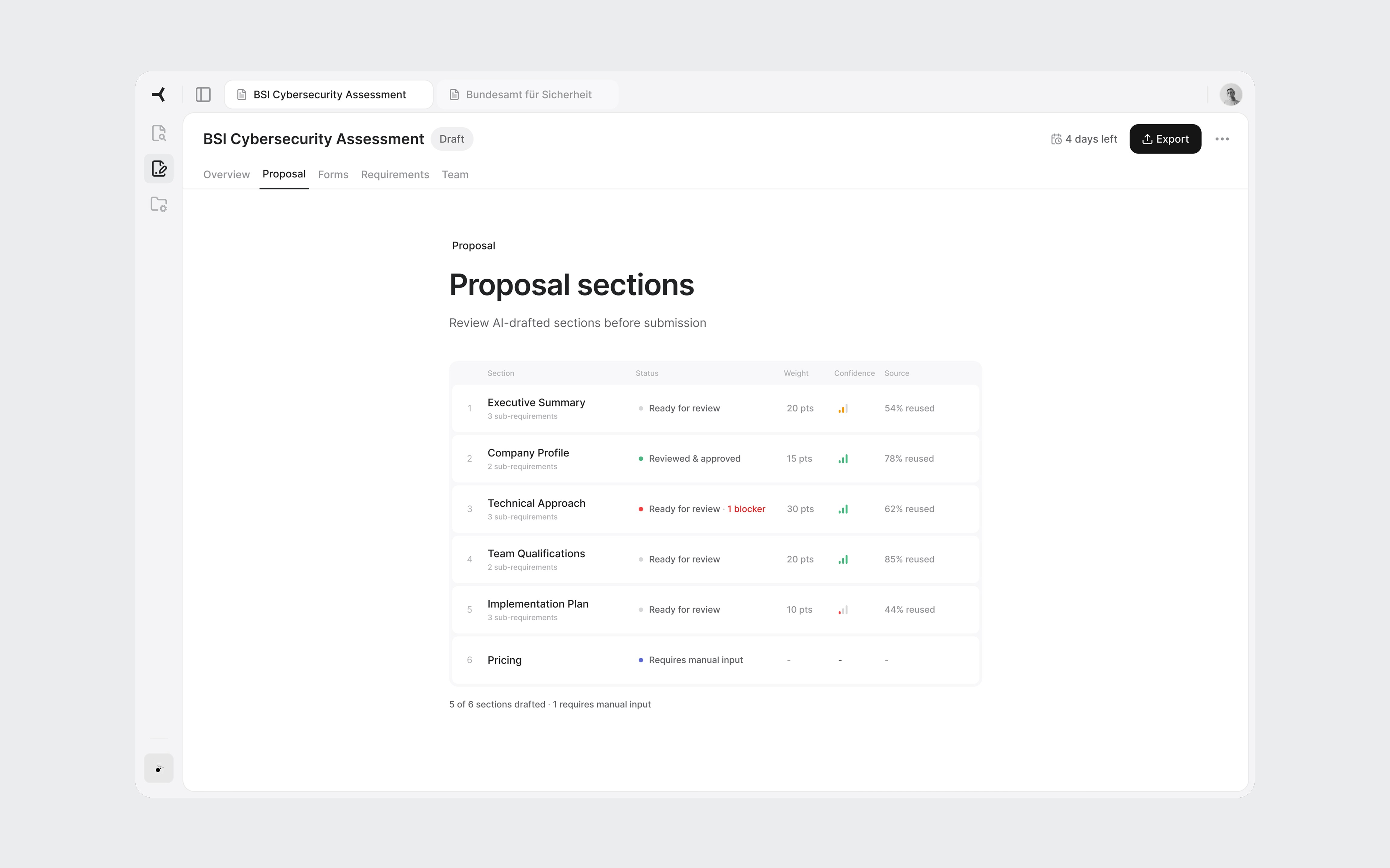 Under the Proposal workspace tab, all sections appear in a table with status, scoring weight, AI confidence, and source reuse percentage. This is a triage view. The user scans and identifies where to start. Technical approach: 30 points, one blocker. That's the obvious first click.