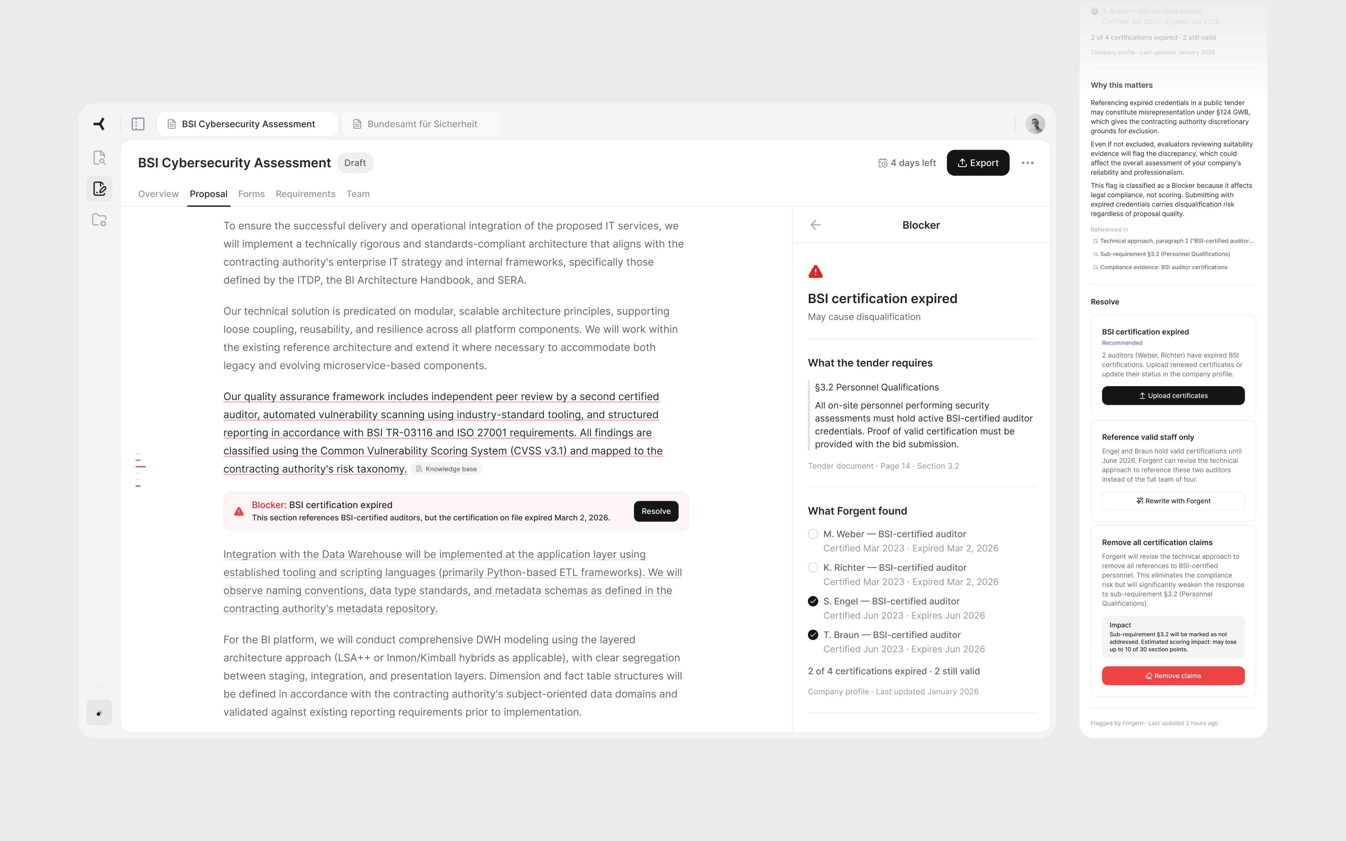 The detail follows the bid manager's decision process. First: what the tender requires, the exact clause. Second: what the AI found. In this case, four auditors listed, two with expired certifications, two valid. Third: why it matters. Referencing expired credentials in a German public tender may constitute misrepresentation under §124 GWB.