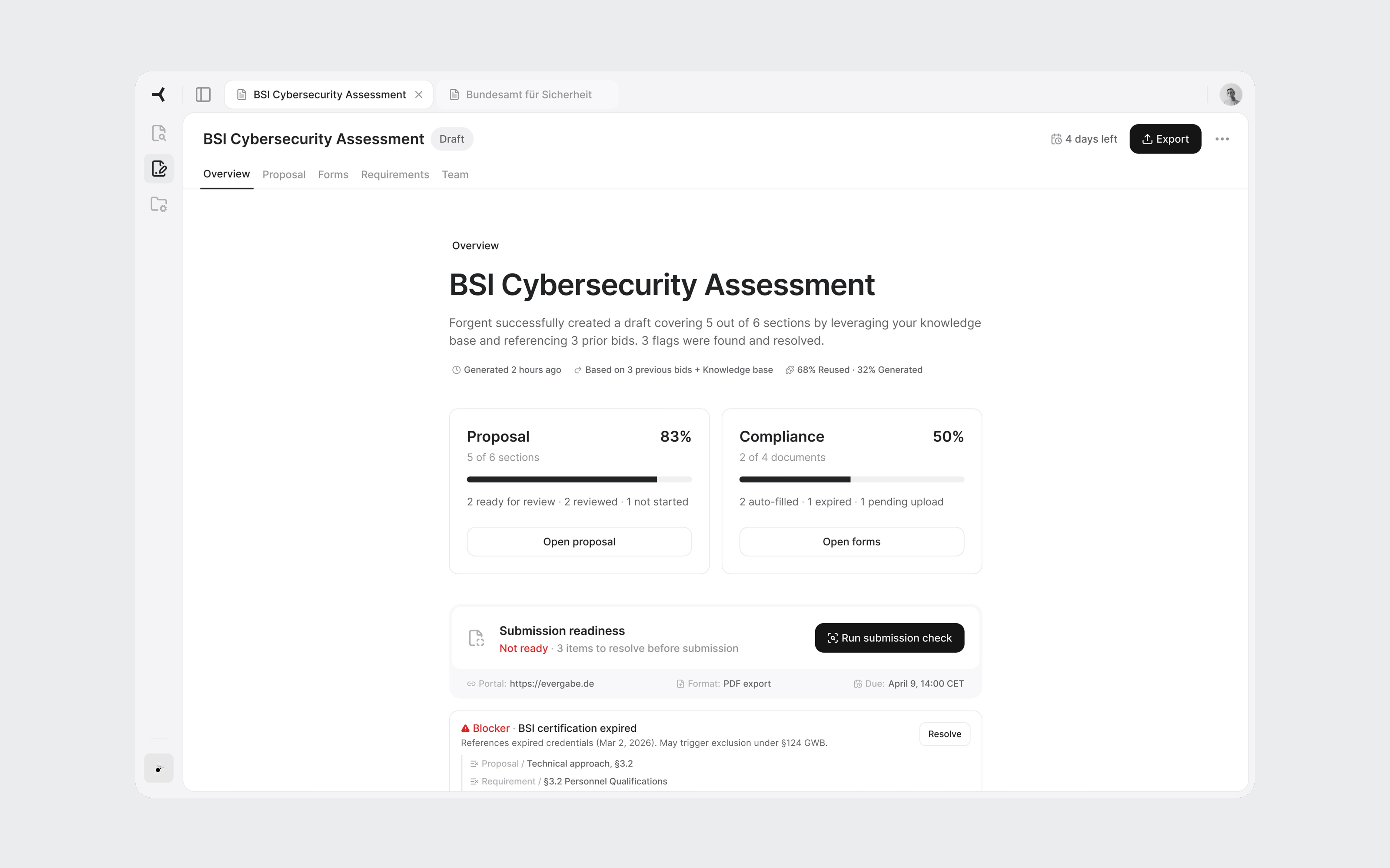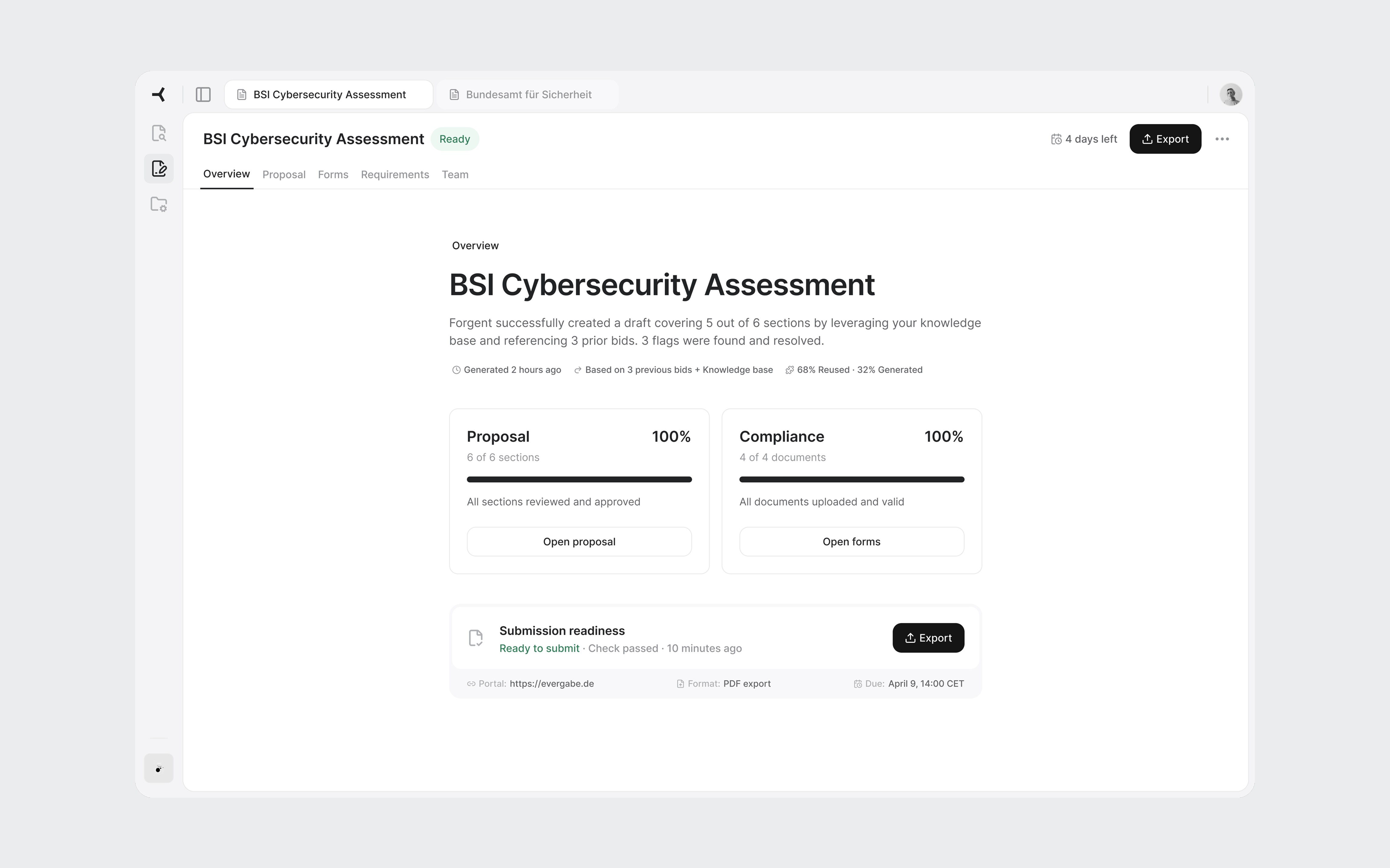 Browser-style tabs in the top bar. Each open tender gets its own tab. Switch between the BSI cybersecurity bid and the infrastructure project without losing your place in either.