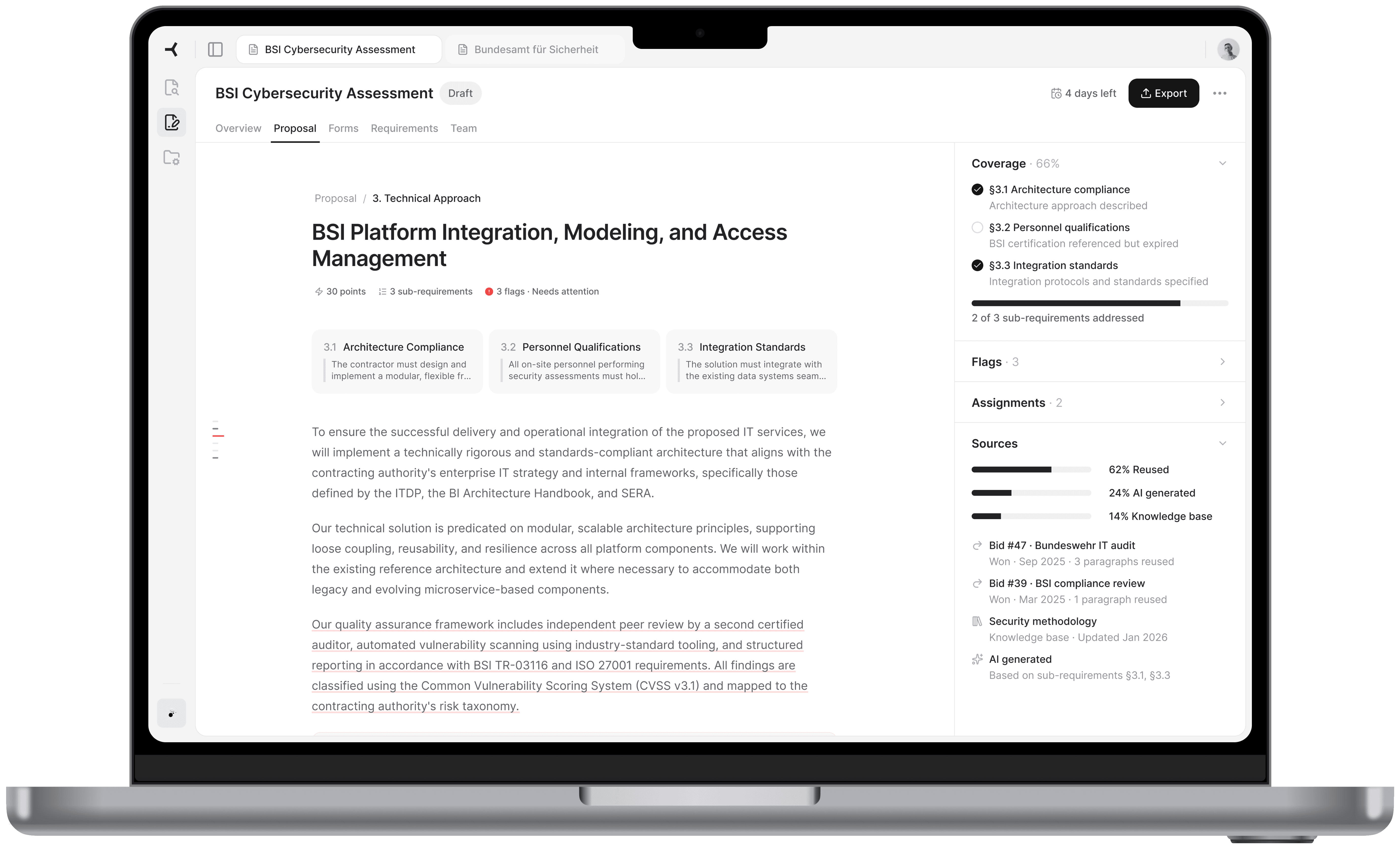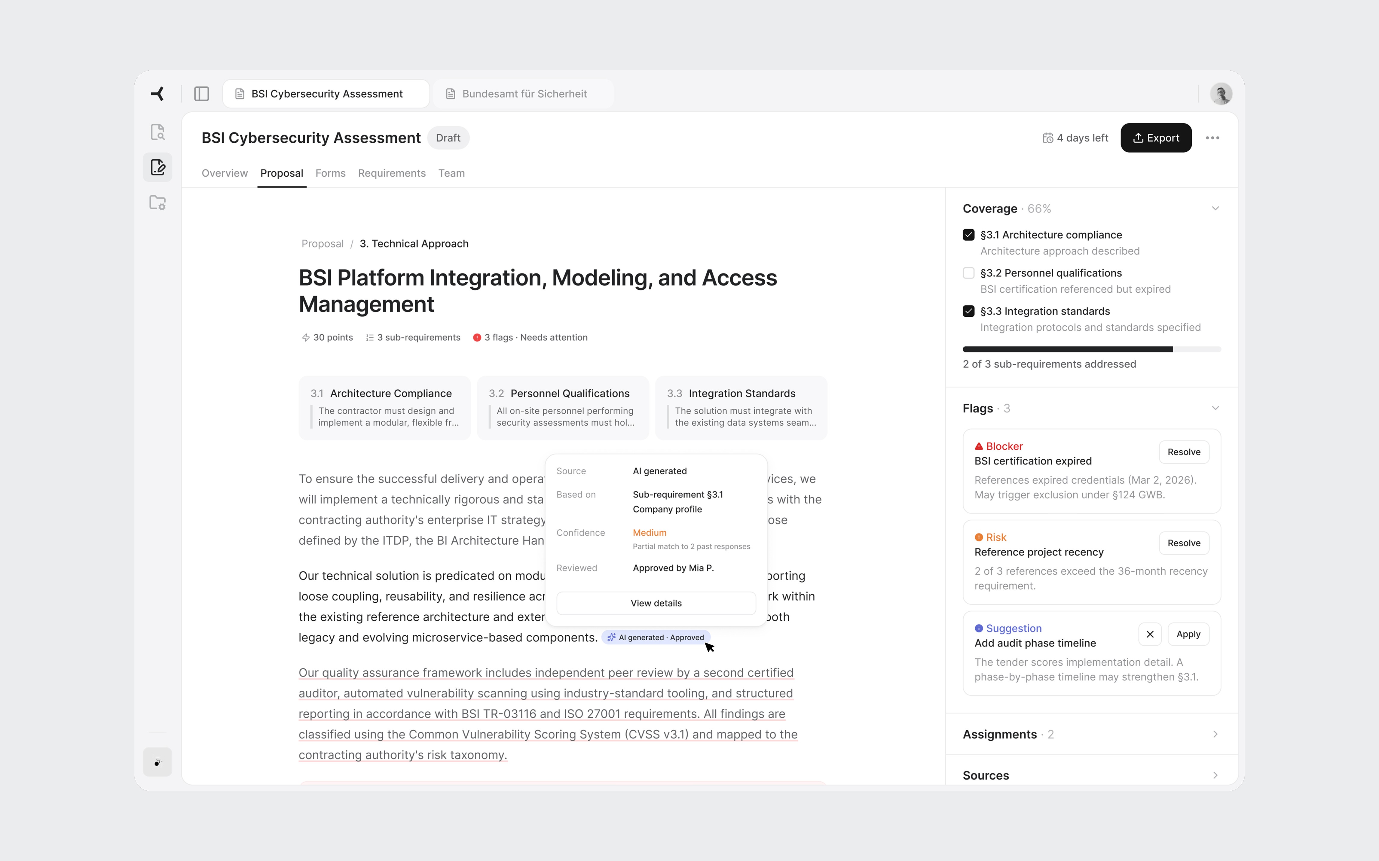 Sub-requirement cards at the top show what the tender asks for in this section. The right panel uses an accordion layout with Coverage, Flags, Assignments, and Sources. I chose accordions over tabs because during review, a flag often has someone assigned to handle it. The reviewer needs to see both without switching views.