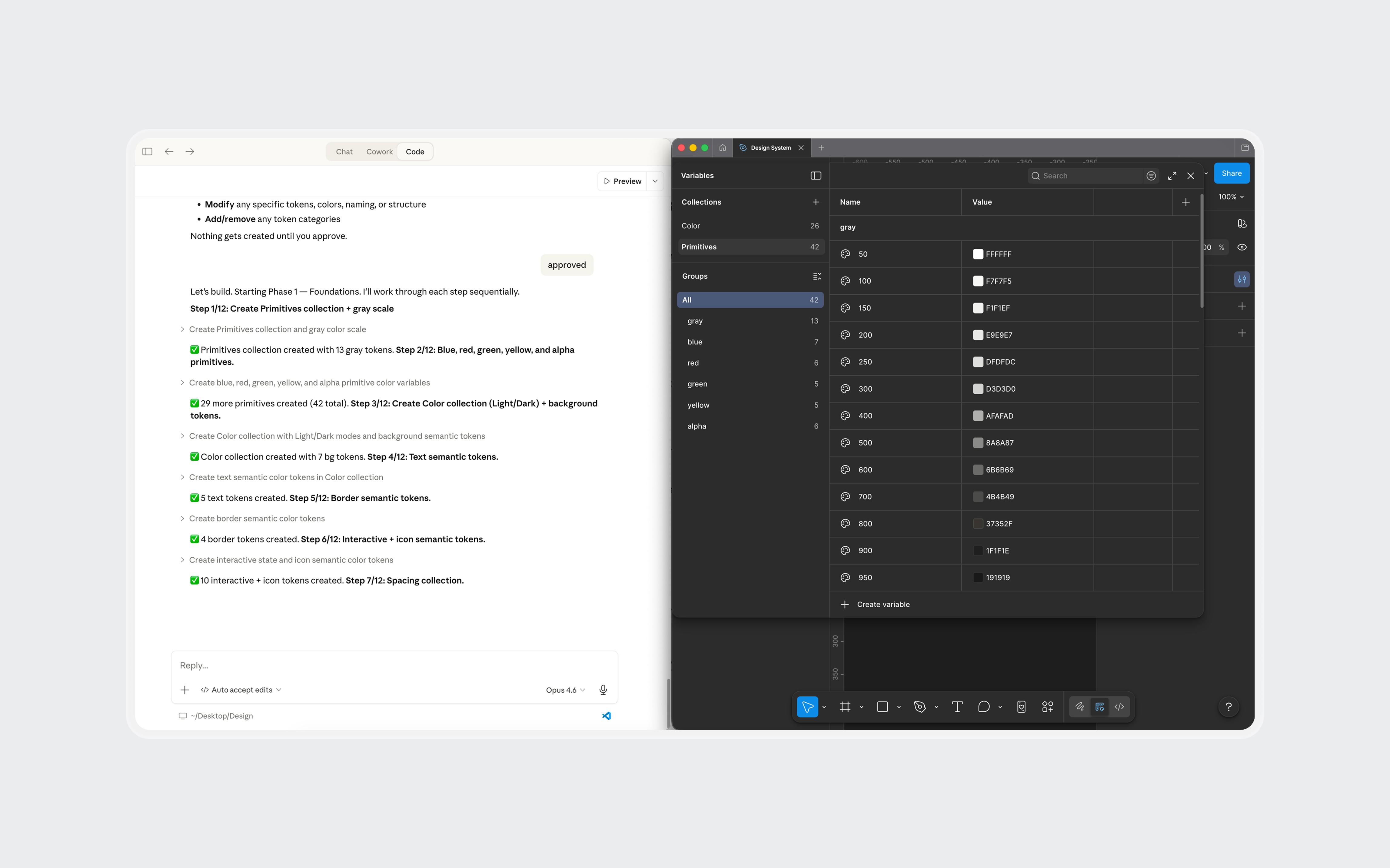 Claude Code, connected to Figma through MCP, generated the token structure and components directly in my file. Foundations came out about 90% right: semantic color mappings, surface hierarchy, spacing system, and basic components like buttons and inputs. Complex components broke down. Some weren't referencing the defined tokens. A slash menu component rendered with overlapping text layers.