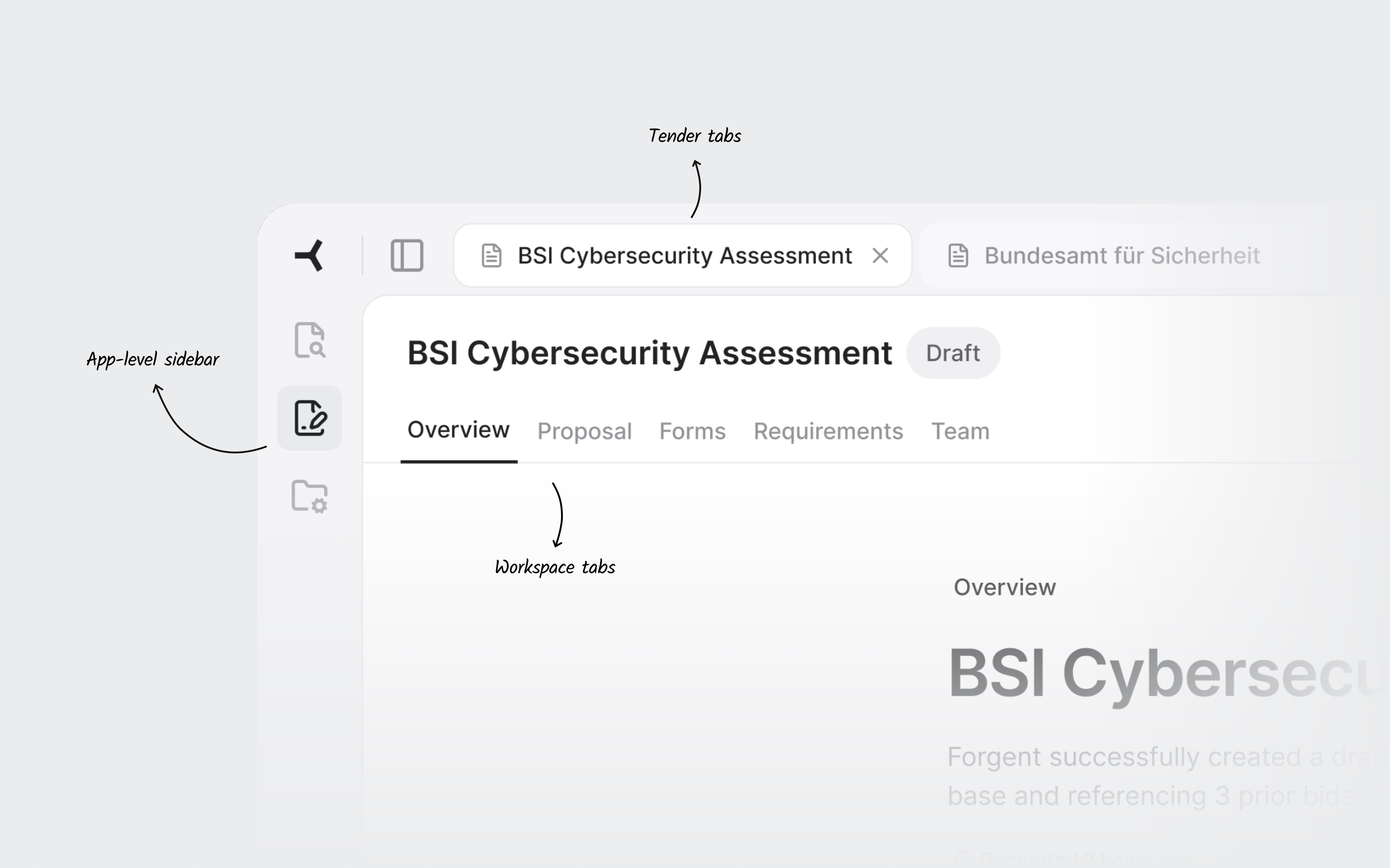 Three navigation layers. The sidebar sets the product area. Tender tabs keep multiple bids accessible. Workspace tabs navigate within one tender.