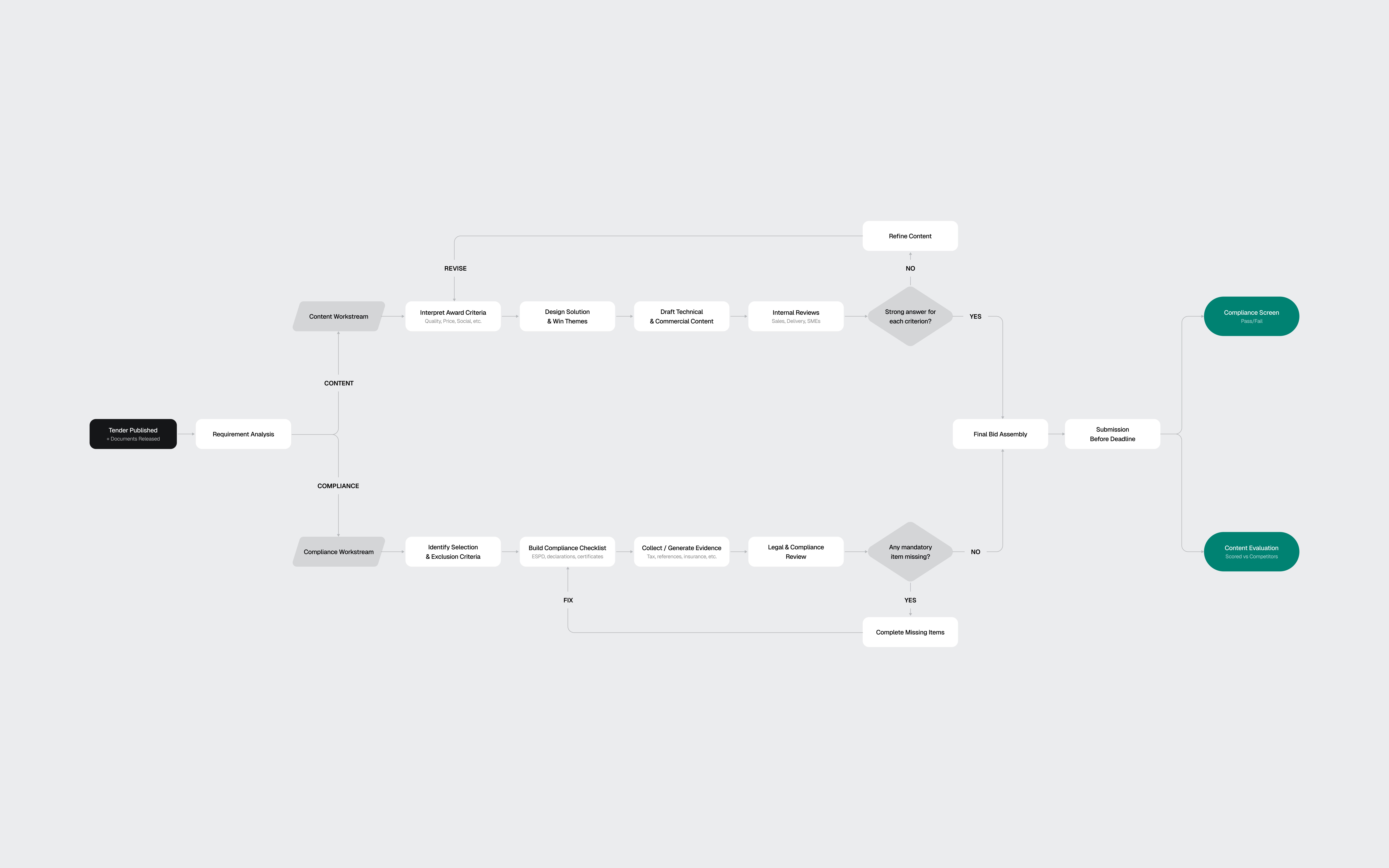 I also looked at existing tools like Loopio, Responsive, and Qvidian, plus AI-first products such as Harvey AI. The pattern was clear: legacy tools handle content reuse well, but the biggest gap was EU-specific compliance logic. Not "Can the tool draft text?" but "Can it keep the team from being disqualified?"